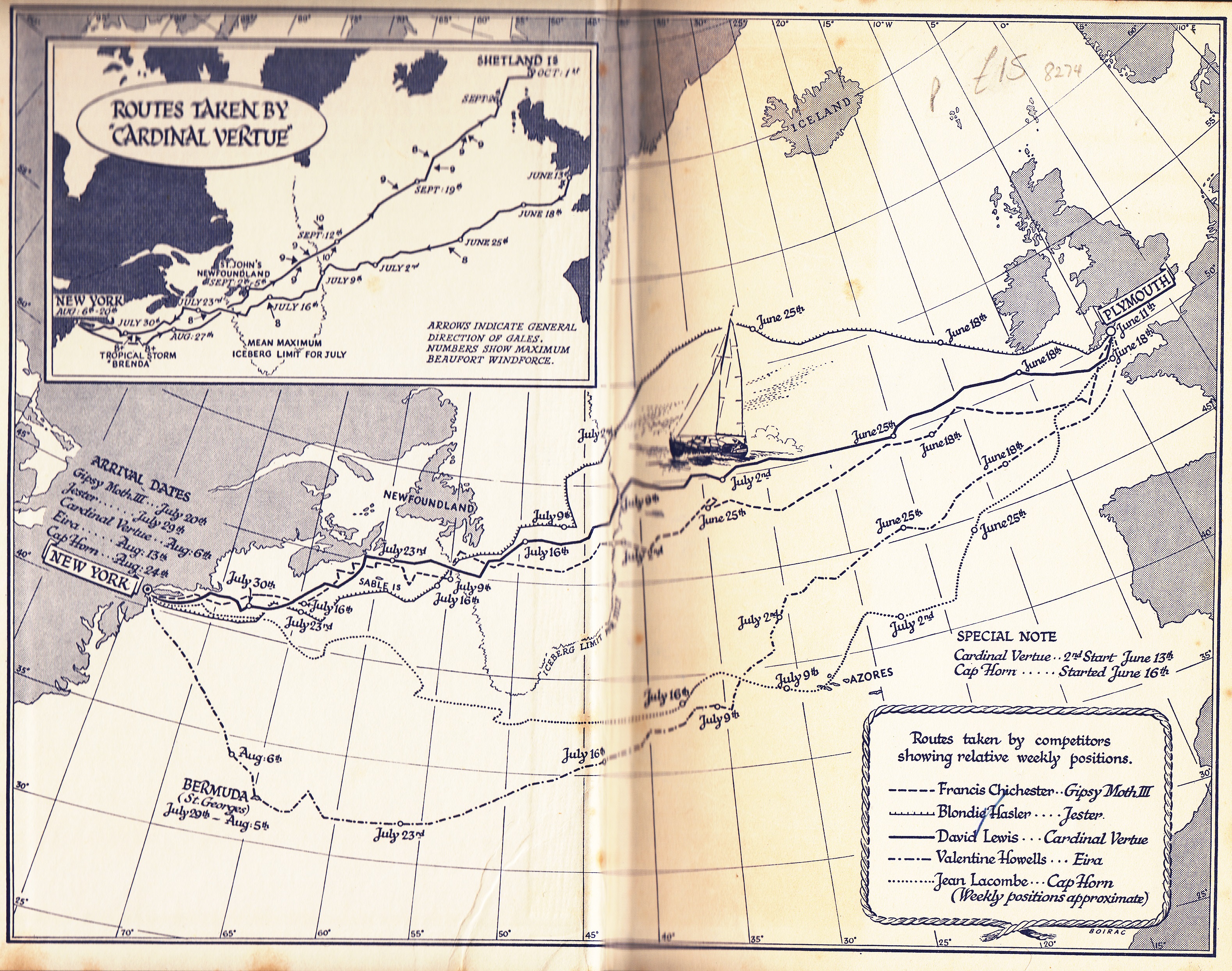 Cardinal Vertue probably has the most distinguished sailing history of any Vertue. Built in 1947 by Elkins boatyard, Christchurch, she had Oak frames with Mahogany planks. David Lewis, a New Zealand Medical Doctor who had recently moved to England, sailed her singlehanded to Stavanger in Norway and back in 1959 to qualify himself as an entrant for the first Transatlantic Race in 1960. Lewis’ book, The Ship Would Not Travel Due West, tells of the race, in which he competed against Francis Chichester, Blondie Hasler, Val Howells, and Jean Lacombe. David sailed her to New York for the race, coming third (First and Second places going to Chichester and Hasler); and he then returned via the stormy North Atlantic route to Shetland.